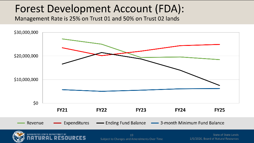 New data, presented by DNR to the Board of Natural Resources shows that DNR’s Forest Development Account, which receives a share of the revenue DNR generates and helps fund agency operations, staffing, and silviculture, has fallen from approximately $20 million to about $6 million today. This decline will only get worse as timber sale volumes continue to decrease and expenditures outpace revenue. As timber revenue falls, DNR’s ability to manage forests, fund staff, and carry out its own mission is increasingly constrained.